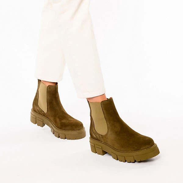 Unterstreichen Ihre Garderobe: Diese trendigen Chelsea Boots von der Marke Apple of Eden. Für ein komfortables Tragegefühl besteht das Fußbett aus Leder. Das Paar ist wärmend gefüttert. Das Obermaterial überzeugt durch echtes Veloursleder. Der niedrige Blockabsatz unterstreicht den ansprechenden Look. Das Schuhpaar kommt ohne jeglichen Verschluss aus, sodass ganz einfach hineingeschlüpft werden kann.