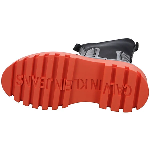 Diese Chelsea-Boots aus schwarzem Leder und passenden Stretcheinsätzen von Calvin Klein geben dem neuen Herbstoutfit den letzten Schliff. Abgrundet wird der stylische Look mit der profilierten orangefarbenen Plateausohle und dem Logo auf der Sohle. Ein echtes Must-Have!