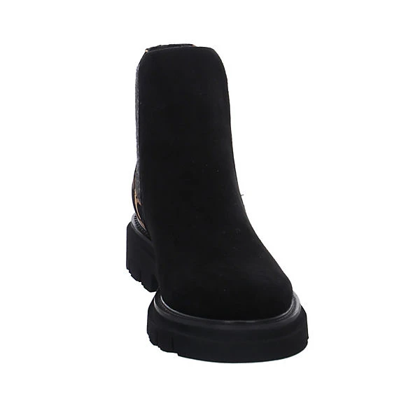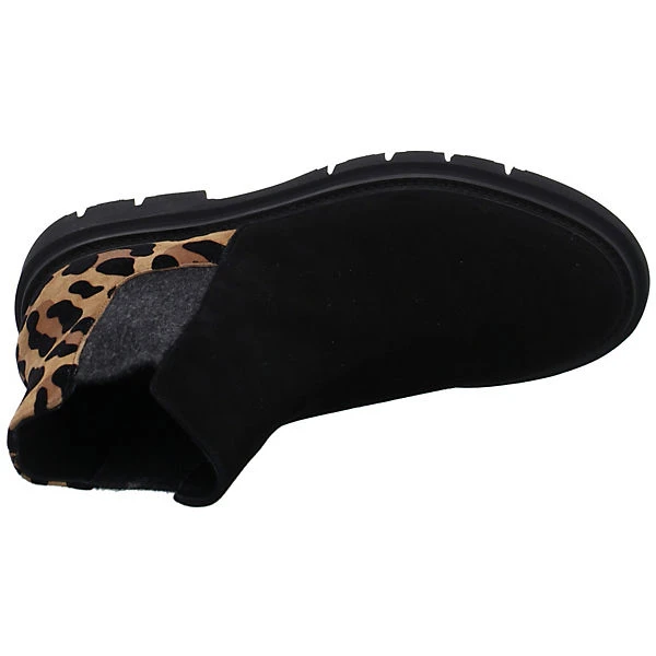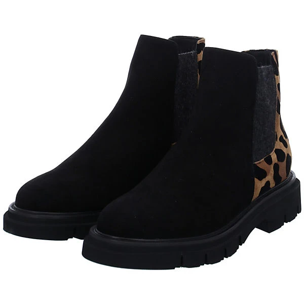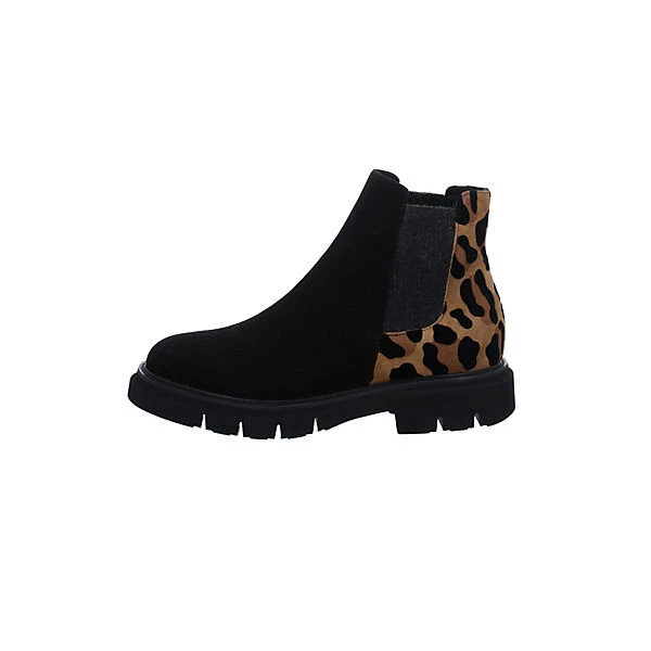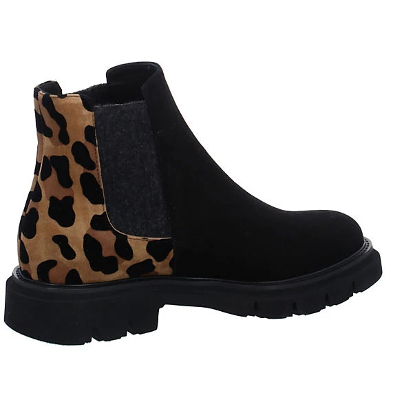 Schwarzes Veloursleder und eine Ferse im Animalprint verleihen diesem edlen Chelsea-Boot von Luca Grossi einen edlen, ausgefallenen Look. Ein grauer Stretcheinsatz vervollständigt das Design. Für einen angenehmen Tragekomfort sorgen die Profillaufsohle und die Lederinnensohle.